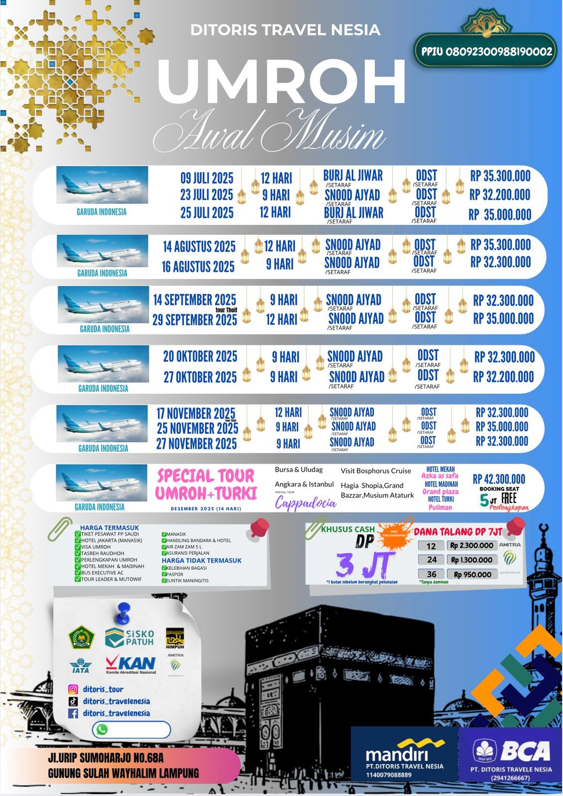 Dengan harga Rp 30.500.000, Anda akan mendapatkan pengalaman spiritual yang tenang dan terencana, mulai dari keberangkatan hingga kembali ke Tanah Air. Kami hadir untuk memastikan setiap jamaah dapat beribadah dengan khusyuk, tanpa khawatir tentang urusan perjalanan.